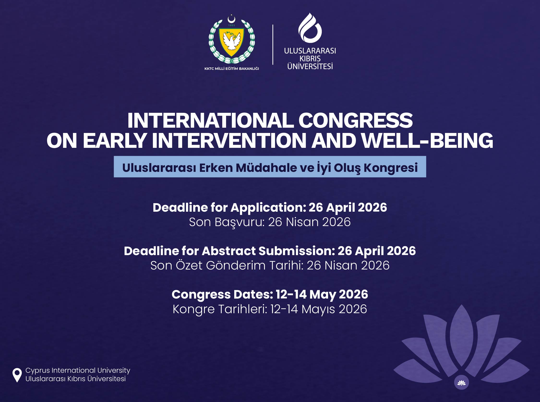 12–14 Mayıs 2026 tarihlerinde, “Yaşamda Denge” temasıyla düzenlenecek olan Uluslararası Erken Müdahale ve İyi Oluş Kongresi-2026, Lefkoşa / KKTC’de gerçekleştirilecektir. Kongre, Uluslararası Kıbrıs Üniversitesi ve KKTC Milli Eğitim Bakanlığı iş birliğinde organize edilmektedir.